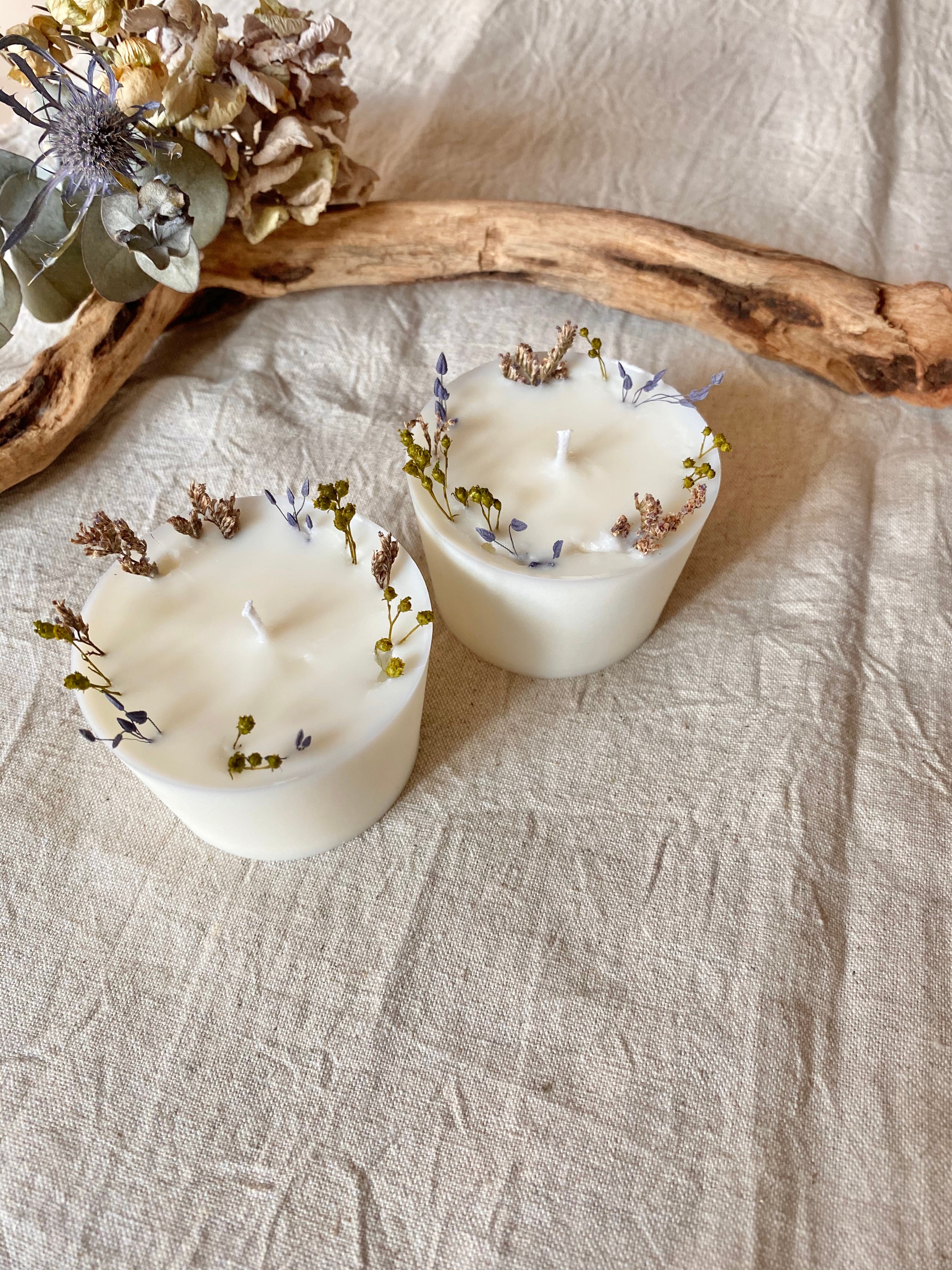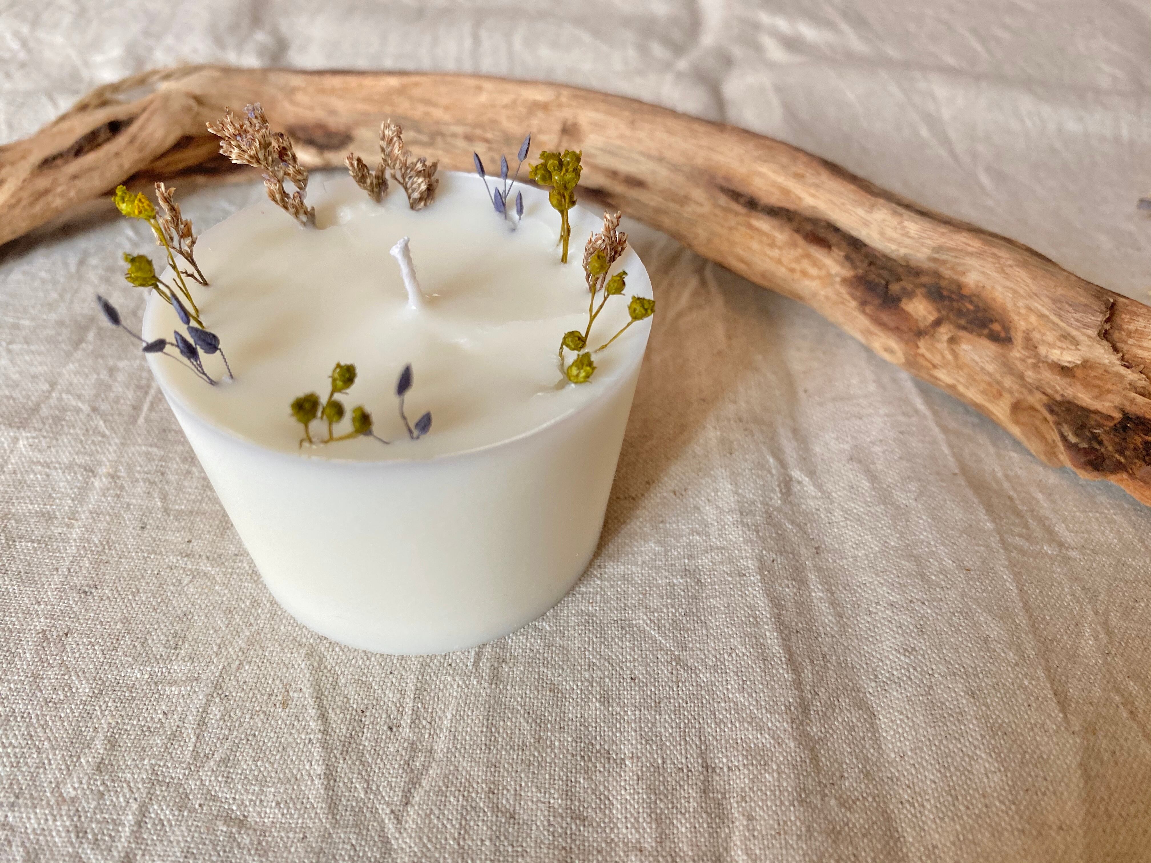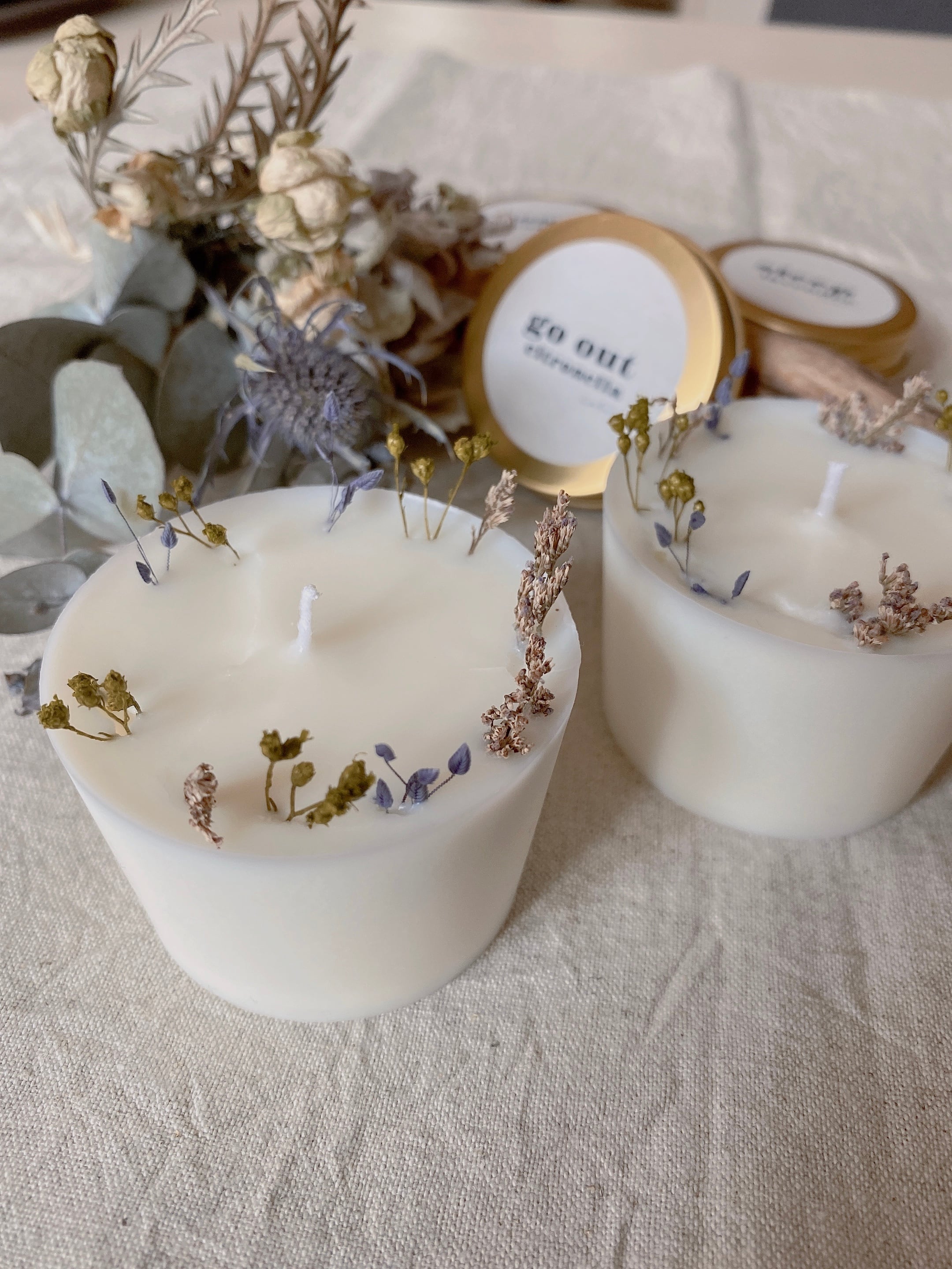 ドライフラワーをあしらったボタニカルキャンドルのsmallサイズ。
